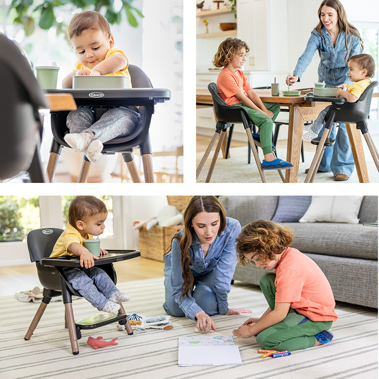 Acest scaun modern si compact ofera 3 moduri diferite, pentru a creste alaturi de copil, combinand stil, confort si versatilitate la fiecare etapa. De la 6 luni pana la aproximativ 3 ani (15 kg) poate fi folosit ca un scaun inalt modern pentru primele mese impreuna. Ajusteaza picioarele si foloseste-l ca scaun jos, ideal pentru gustari. De la 3 ani pana la aproximativ 6 ani (27,3 kg), se poate transforma intr-un taburet chic pentru copii, perfect pentru mese independente.